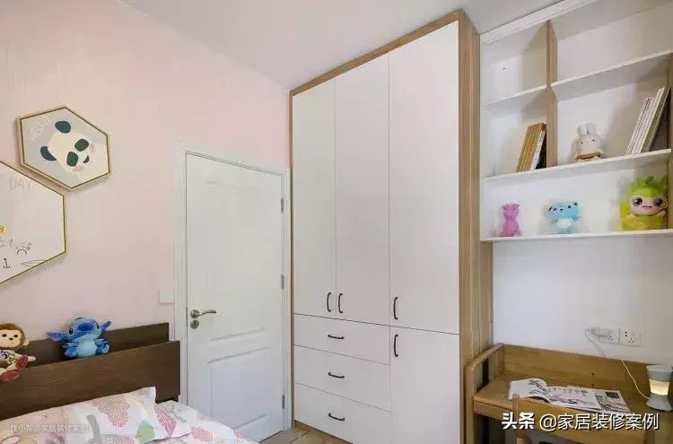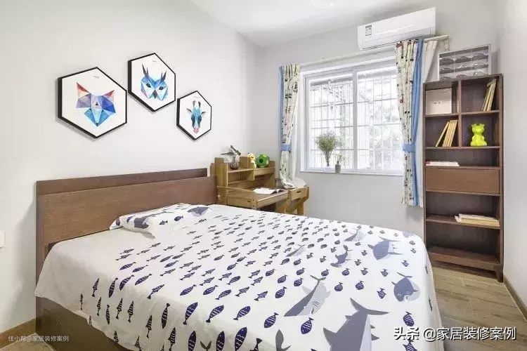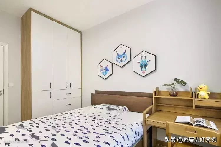 儿童房空间小,墙面用粉色增添温馨感,并用六角简易画装饰,实木床搭配植物图案的被单,营造出柔和温润的生活气息。