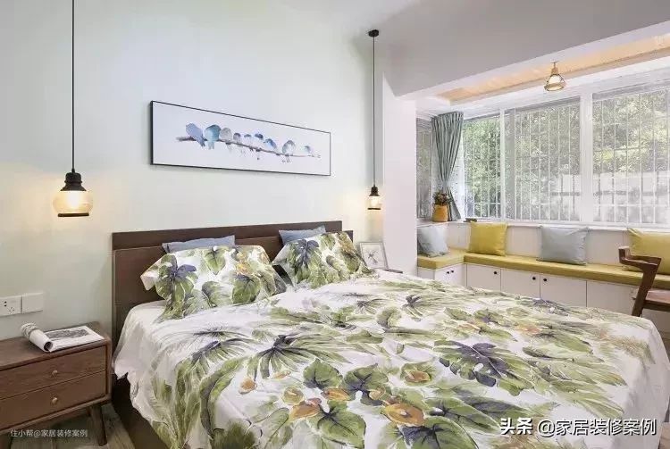 卧室使用的是实木床,床头分别搭配两盏吊灯和床头柜,与墙面挂画形成对称美感,床单图案选用了绿色系,适合休息入眠。