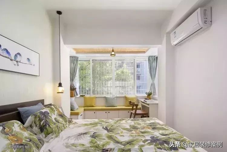 卧室与阳台打通,使卧室的空间面积变大,在窗台下方安装了一排储物柜和书桌,柜子上方铺上软垫和抱枕可用来当凳子坐,非常实用的设计。