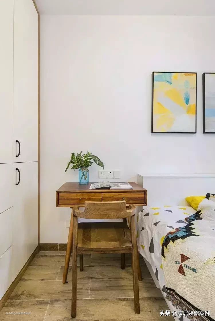 卧室主要以原木色和白色为主,白色的墙面和白色的衣柜门板,搭配原木家具,简约温馨的布置,给人一种宁静舒适感。