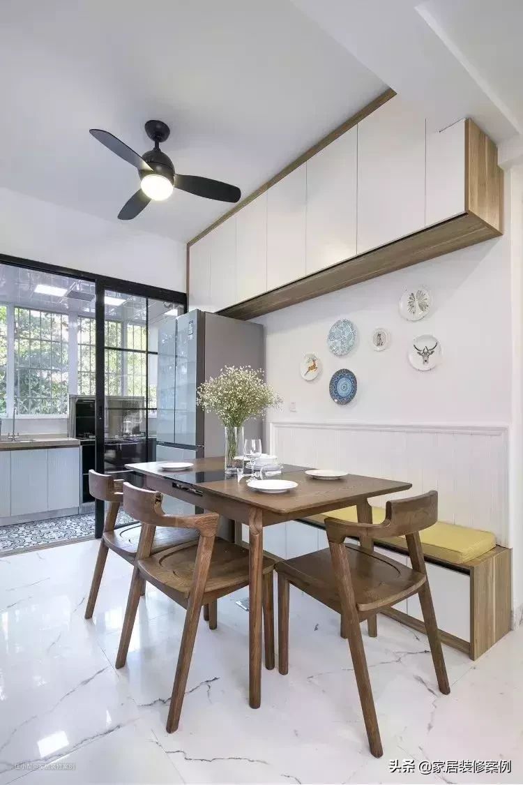 客厅摆放的是一套实木餐桌,墙面安装了卡座加吊柜的设计,既节省了空间又解决了收纳不足的问题。