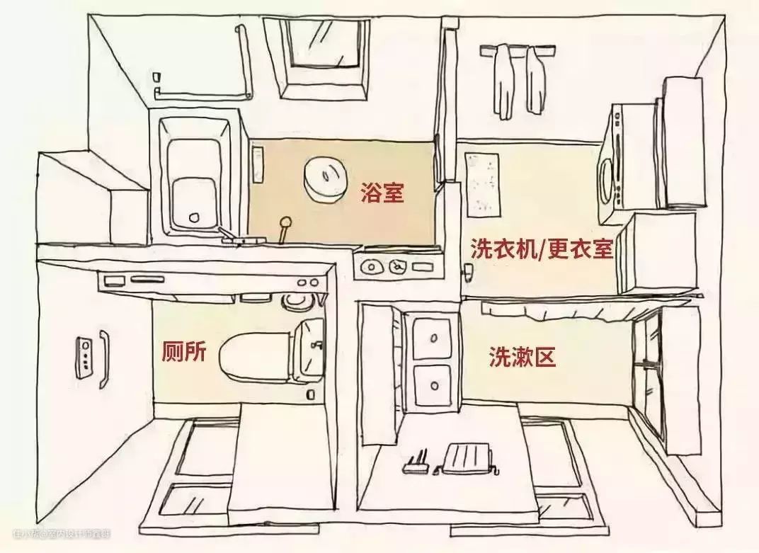 “四式”:马桶、洗面台或洗手池、浴室(包括浴缸和淋浴)以及洗衣机。大约8平方米就能搞定。