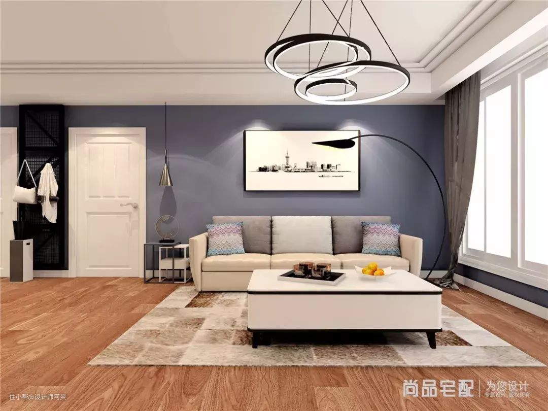 ▲地砖也能有人字形的图案,担心地砖花哨?墙面和家具,不耍款式,简单搭配即可。例如芋头紫的墙面,配上蓝黑色的沙发,以色取胜,极有格调。