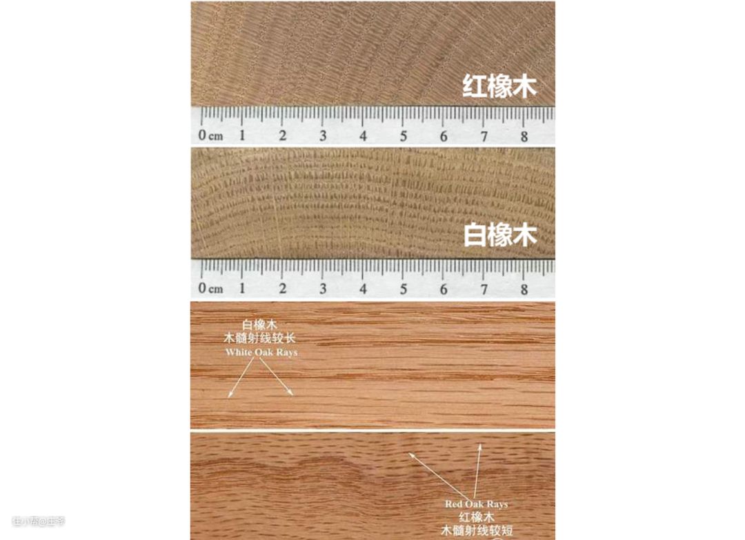 红橡木跟白橡木的纹理表面看起来,没有太大的差异性,但是仔细看还是有分别的,可以通过木材的横截面和木髓射线来区分。