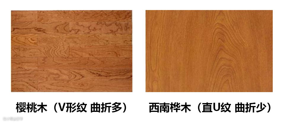 樱桃木的花纹为V形,纹理细密,相对有些曲折;西南桦木的花纹多为直U纹,V纹较少。