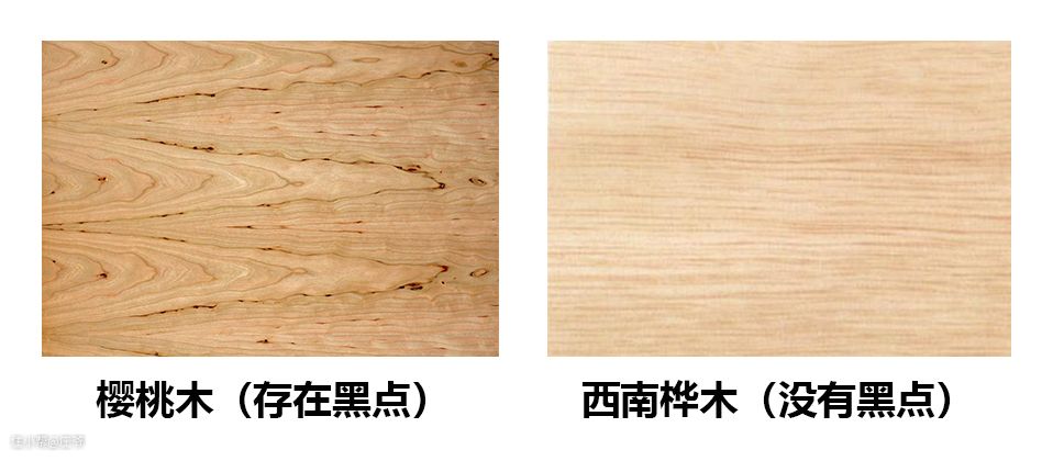 樱桃木表面还不规则地分布一些黑点;西南桦木没有黑点。