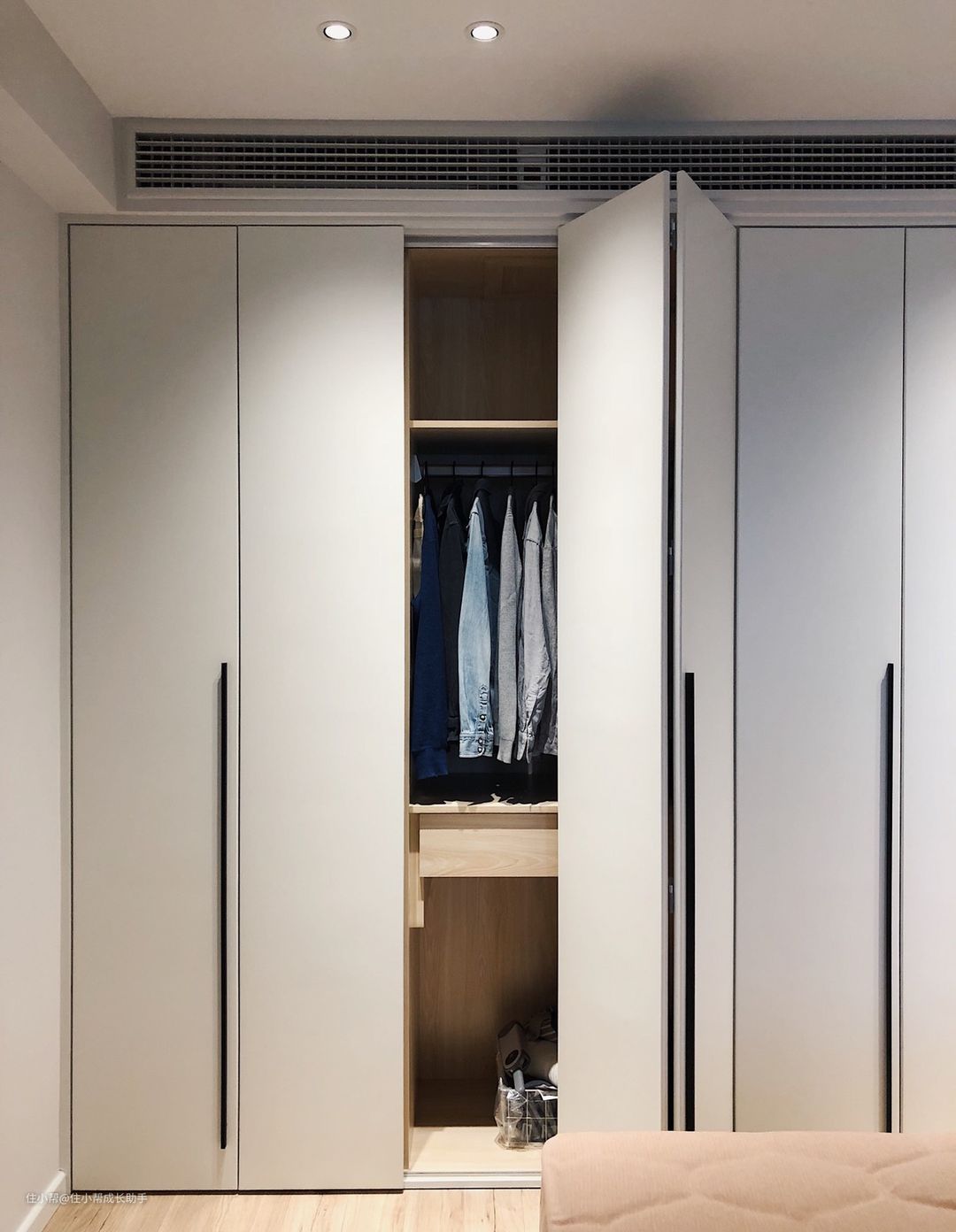 因为空间不算大,所以做了顶天立地的柜子,选择纯白无任何装饰的柜门,没有太多的存在感,像一面白墙,在视觉上还有扩大空间的效果,最重要的是收纳功能感人。