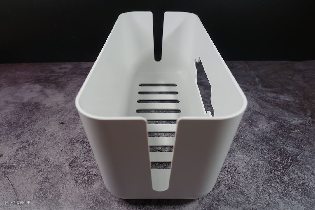 盒身的两侧都留有开口,方便线材的进出。除此之外,盒身的背部也留有可供插头进入的开孔,而且空洞面积足够大。这样,收纳盒的三面都可以让线材或插头进出。相比斐讯TC1只能从背部进入插头要方便不少。