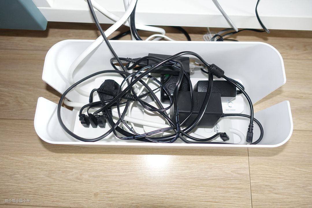 以上这些设备,如果想通过装修的时候预留插座的话,估计墙上满排都是插座了。现在,我通过收纳盒加排插的方式,既解决了插座数量不足,又可以尽可能做到美观得体。由于网易智选收纳盒三面都可以走线,所以即使是这么多插座和电线进出也毫无压力。虽然收纳盒里面各种插座和电线相互交织显得十分凌乱。但是盒子盖上后,就都隐藏到收纳盒里面了。