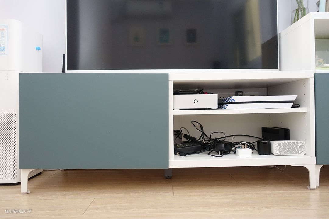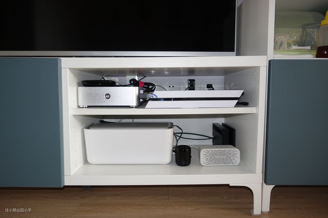 所有的插座全部安置妥当后,还上收纳盒的盖子,把收纳盒往电视机柜里面一推,本来一团凌乱的场景再次变得眼不见为净了。虽然心里面也明白乱七八糟的电线和插座都还在那里,但是平时除非是打扫卫生,根本不会注意到这些不协调的场景了。