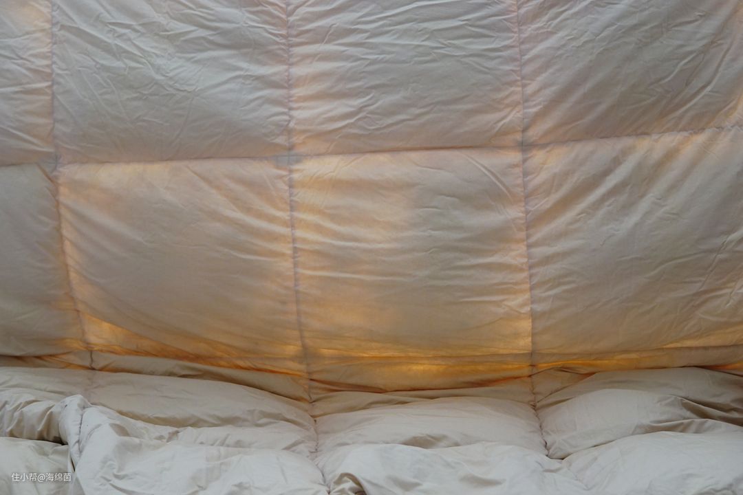 可以看到OBB米里茨冬被的充绒非常饱满,基本每个格子都塞满了鹅绒,光线只能从格子间的踩线处透过来。