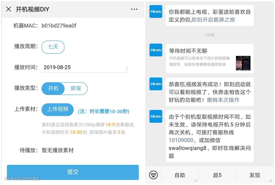 用户通过电视端的扫码,可以进入设置页面,并在完成视频上传后,会出现截图右侧的提示。