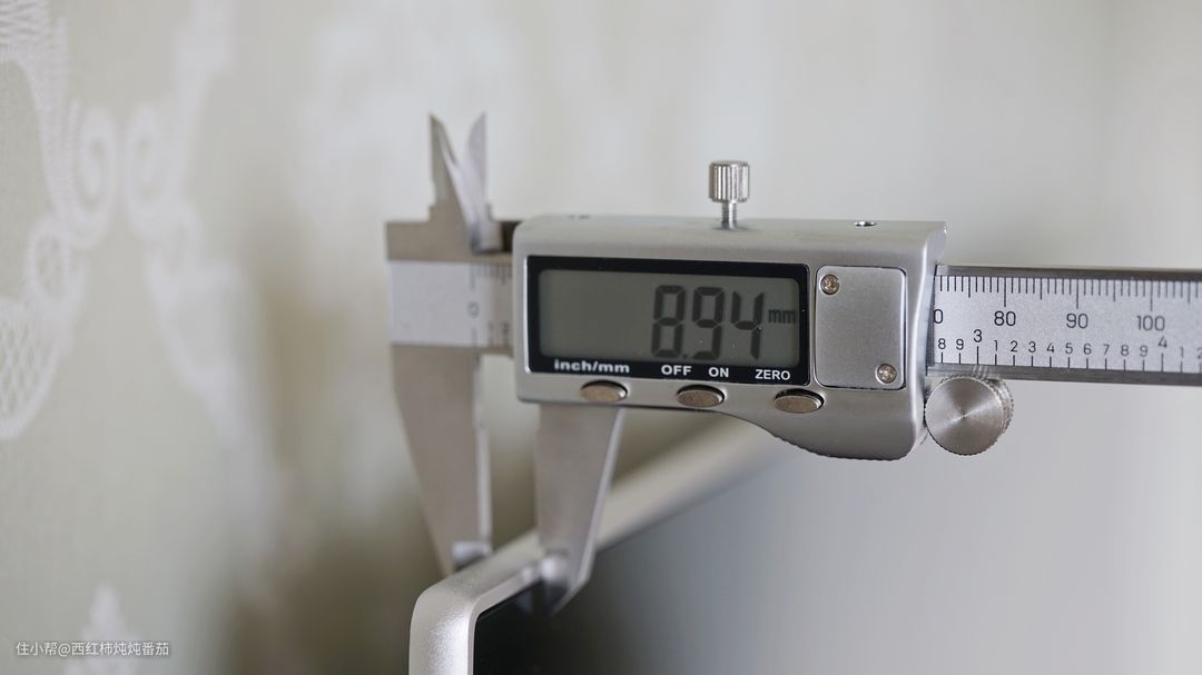 与索尼方正的边角设计不同,超5的倒角显得比较圆润,在增加可靠性的同时,也更符合中国人的审美。根据官宣页面,这台电视最薄处的厚度仅为 8.8mm。恰好楼主手里有设备,那么就简单测试一下——