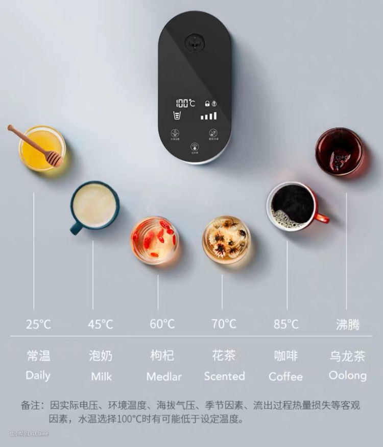日常使用热水场景比较多,例如泡奶、泡茶、泡咖啡等,因此集米设计了六段水温选择功能,从“25℃”到“100℃”,使用时只需轻触机器顶部的“水温设置”按键,选择你需要的出水温度即可。