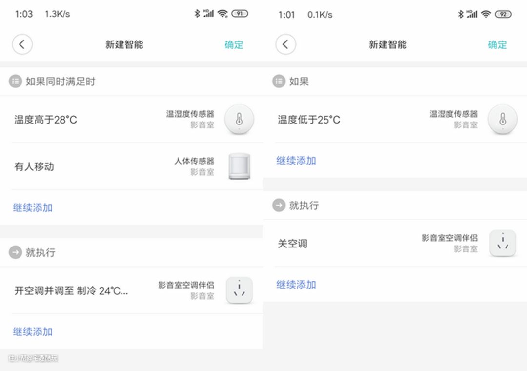 温度自动化应用 温度自动化通过空调伴侣和温湿度传感器的联动就可以实现了。需要注意的是,温湿度传感器的位置摆放不要在空调的吹风方向,以免测定的数据不准确。