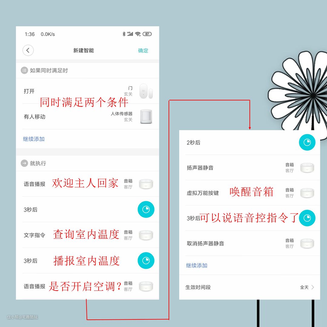 ▼这就是一个基础回家模式,其主要是实现回家开门后,智能音箱自动播放欢迎语——自动播放室内温度——询问是否空打开调——自动唤醒音箱——等待语音指令