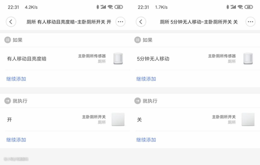满足条件1:5分钟内没有检测到人体移动。执行:关闭卫生间开关