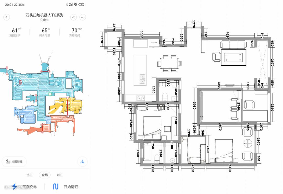 ▼这次石头T6在精确房间测绘的基础上,对算法进行了升级。在保证房间测绘精度的下,同时实现了房间区域的自动识别(支持手动设置空间区域)。非常实用的功能,这样就可以让石头去清扫指定的房间了。开启地图保存模式后,T6可记忆全家地图,指哪打哪,自动回充