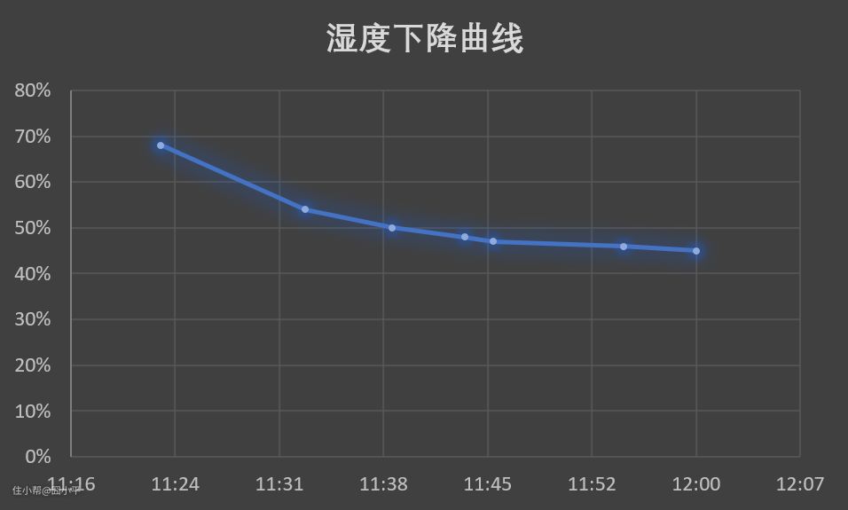 将上面的数据汇总,做成以时间为横坐标,湿度为纵坐标的曲线图,可以发现达到湿度50%后,继续下降的速度明显降低了。而且前面也讲过了,除湿机工作的时候,吹出来的风会比环境温度高一些,长时间运行室温也有所上升。