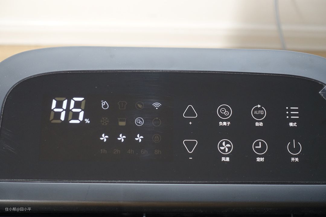 触控面板的右侧区域是功能按键区,一共有8个触控按键;左侧区域是功能状态显示区,可以显示当前湿度,除湿机的工作状态等等。