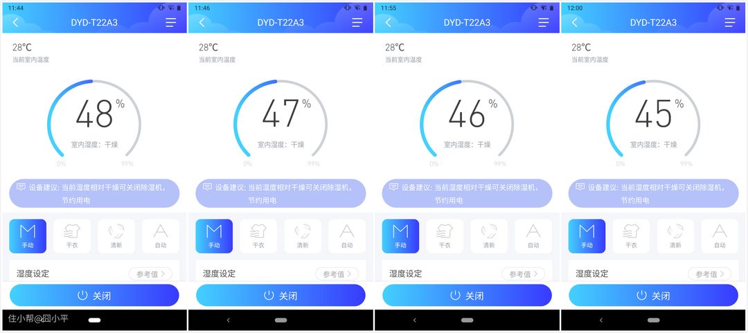 在这个阶段,湿度从70%左右降到50%左右,湿度下降的速度还是比较快的。下面继续观察。室内湿度稳定达到48%的时间是11:44,湿度稳定达到47%的时间是11:46,湿度稳定达到46%的时间是11:55,湿度稳定达到45%的时间是12:00。除湿机达到预设湿度后自动停机,当前室内温度为28°。