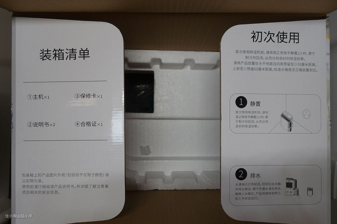打开包装,可以看到包装上印有除湿机初次使用的注意事项。主要有两点需要注意:1.首次使用前,需要将除湿机正常平放静置两个小时,便于制冷剂回流,保证除湿效果;2.产品放置在水平地面,四周需要预留50cm以上距离,上部需预留60cm以上距离,以保证空气流通。