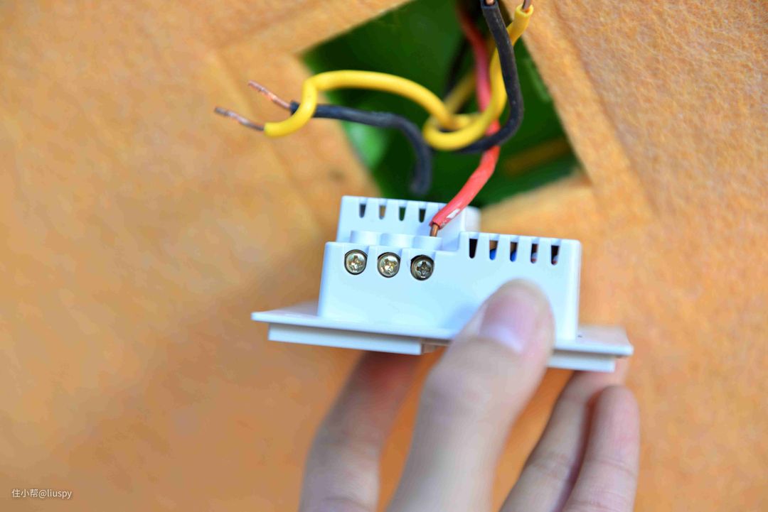 ▼之后我们把开关推回86盒内,锁上固定的螺丝,并闭合空气开关,通电。不要着急安装前面板,我们先测试一下,用螺丝刀按下面的小圆点,看能否开灯。