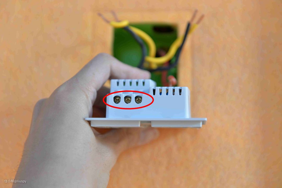 ▼接着我们可以看到开关的上部分有三个螺丝,这是用来固定接线的螺丝,我们需要做的就是把这三个螺丝都拧开