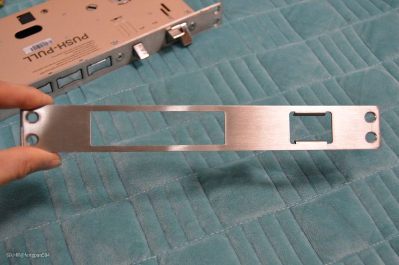 ▼面板的背面工艺跟外面版一致,都是采用钢板较硅胶垫片的设计,除去两侧的螺丝空位中间的孔位是连接面板、锁体和锁芯的。