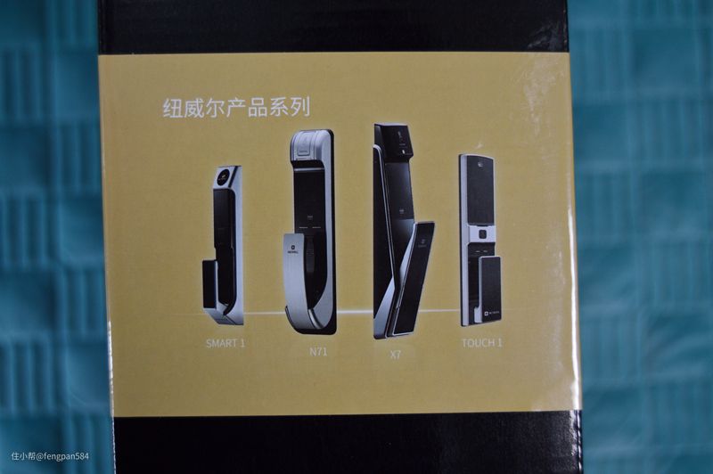 ▼在包装盒中间的贴纸上介绍了纽威尔N71智能锁的功能特点:荣获韩国金奖设计、维拉式开锁专利、自动上锁功能、静音锁体、活体指纹识别技术、虚伪密码输入设计、火灾报警功能、365天持久续航。