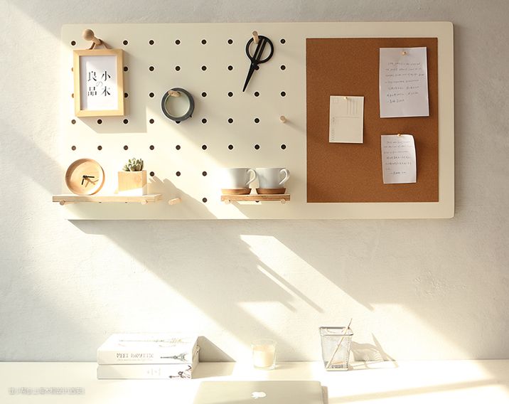 ①买洞洞板之前,先确定收纳物品的重量和所需面积。在承重范围内,购入一个比物品实际占用面积稍大一点的洞洞板。