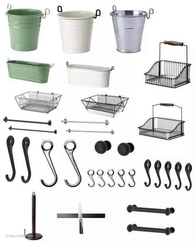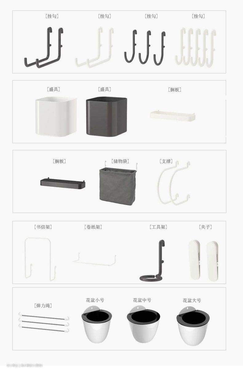 在洞洞板上,还能搭配挂钩、盛具、隔板、储物袋、工具架、强力绳、花盆等零件,让你的居家好物都美美哒上墙~