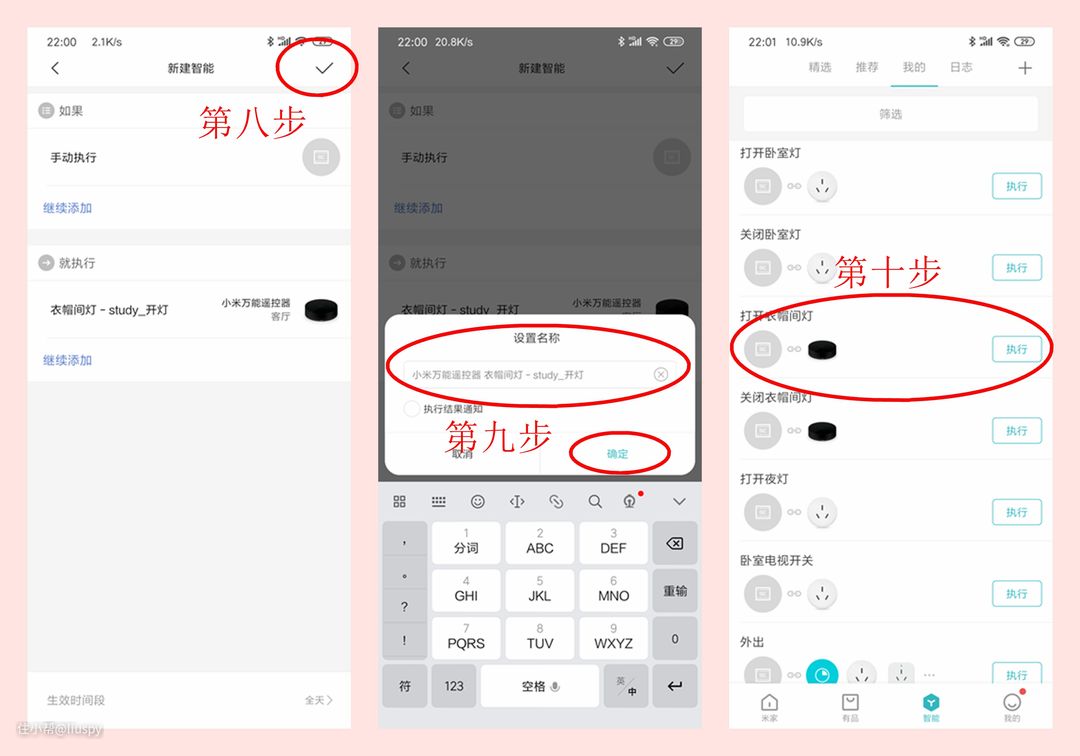 ▼设置完成后,确定,并取一个场景模式的名字。最后在智能页面就可以看到我们新建的场景模式了,我这里起的名字就叫做“打开衣帽间灯”。