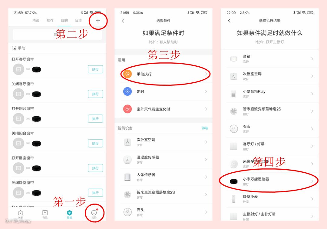 ▼首先我们需要在米家APP——智能页面——右上角添加一个新的场景模式。满足的条件务必选择手动执行,执行的设备选择万能遥控器