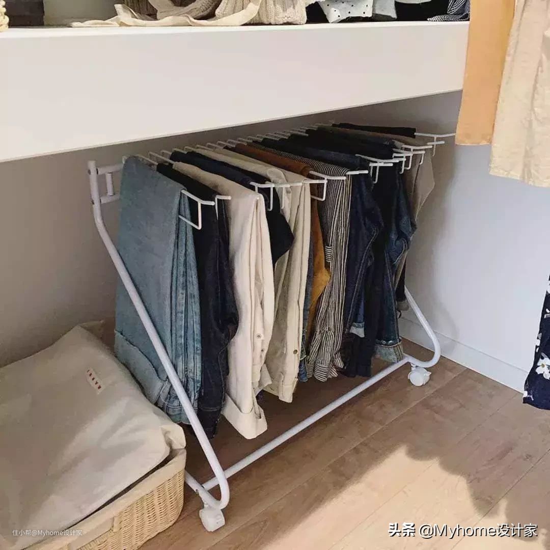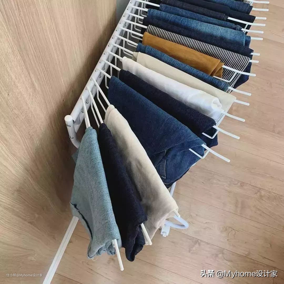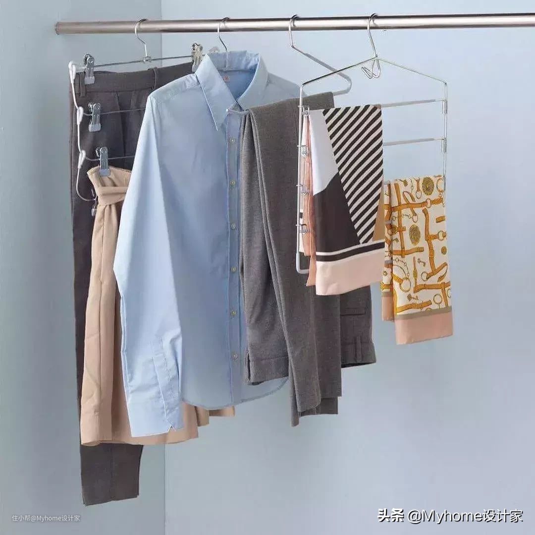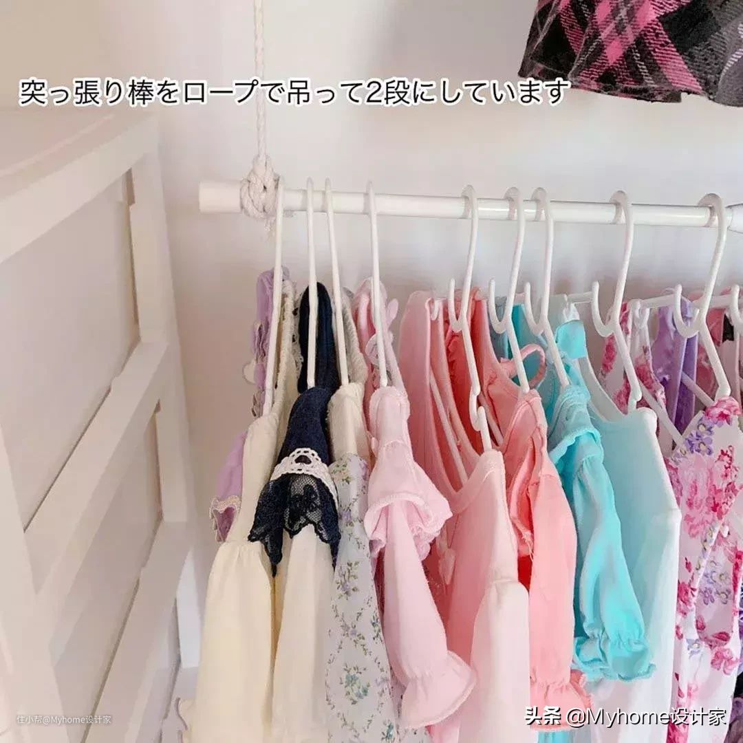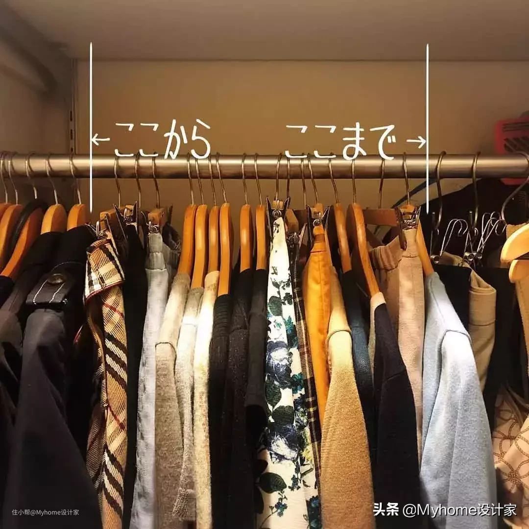 像日本主妇shoko将长裤对折吊挂,再依序安排短衣、长洋装、外套,形成阶梯状的吊挂设计,下方就留出有秩序的方正空间。