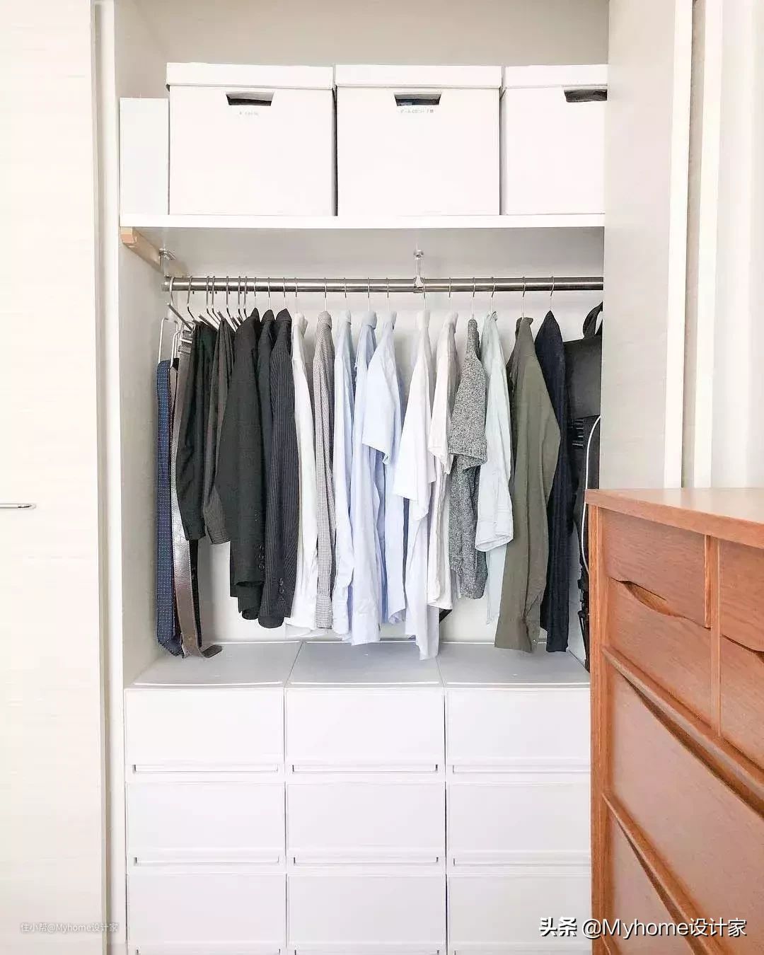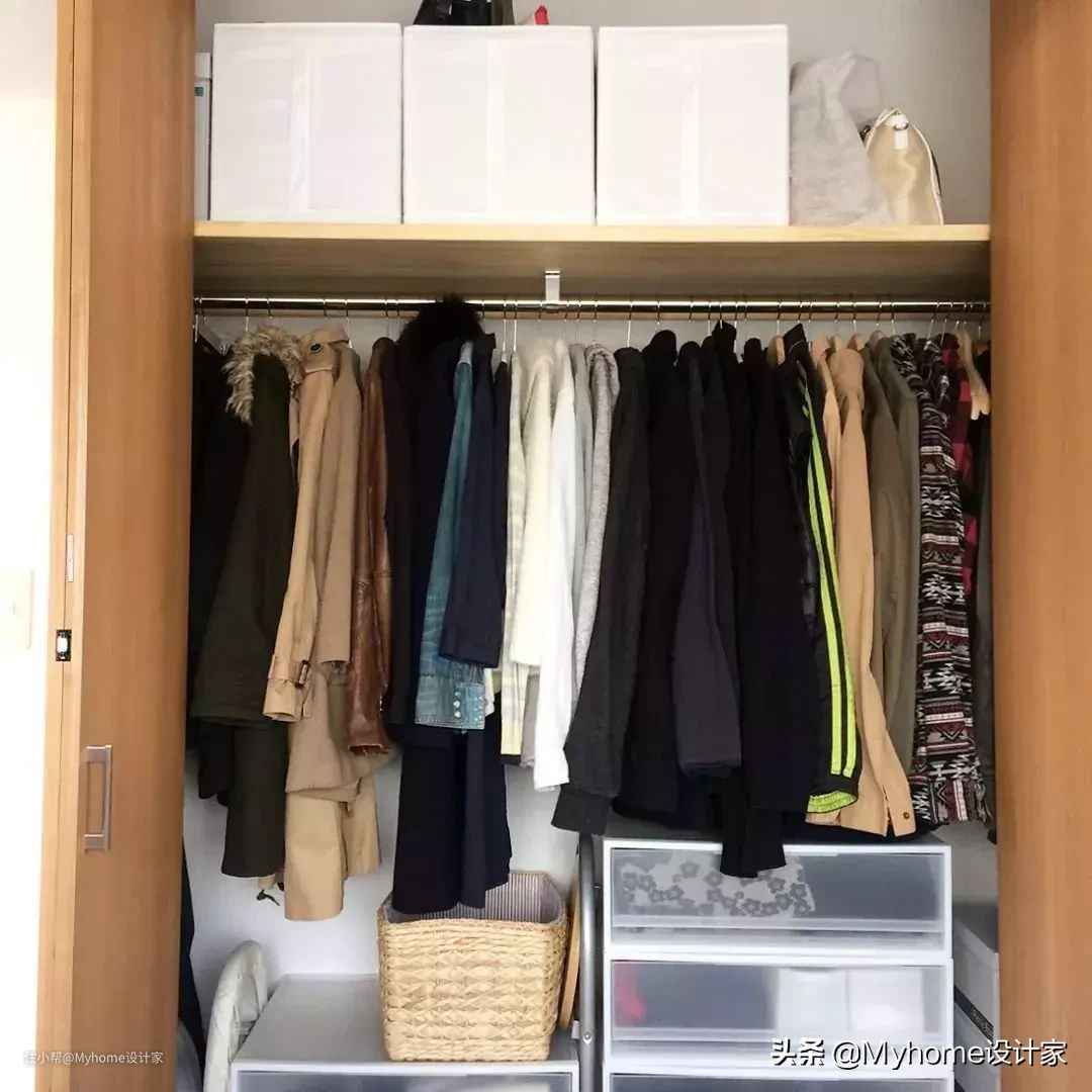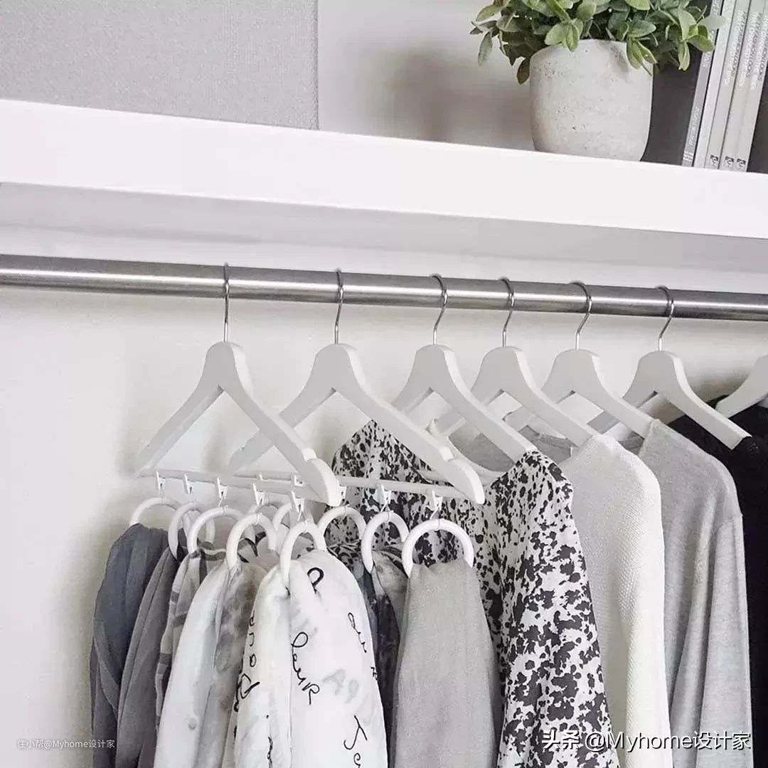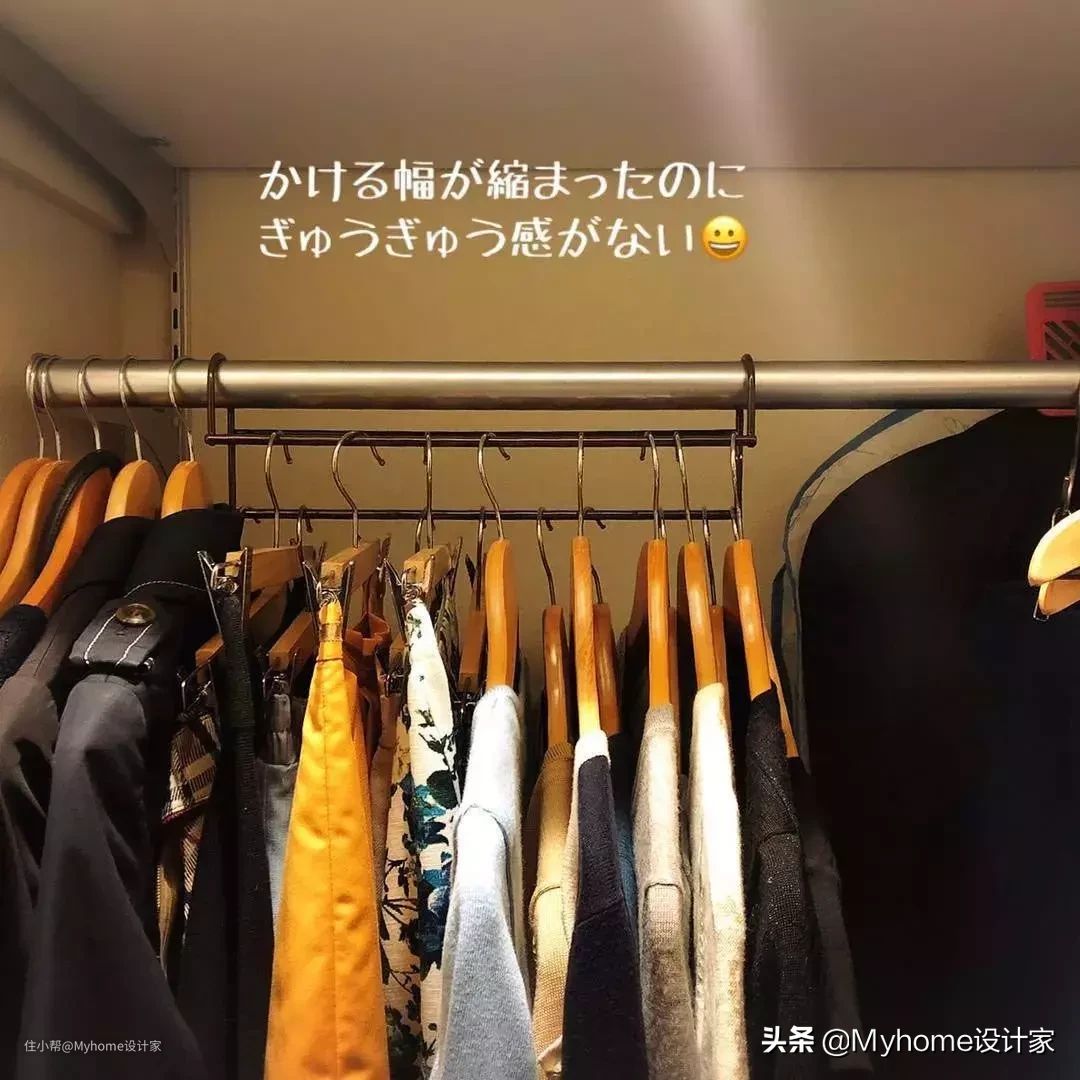 像日本主妇shoko将长裤对折吊挂,再依序安排短衣、长洋装、外套,形成阶梯状的吊挂设计,下方就留出有秩序的方正空间。