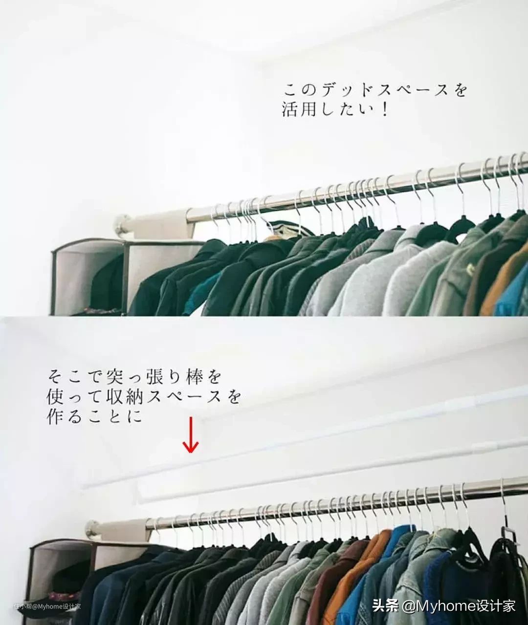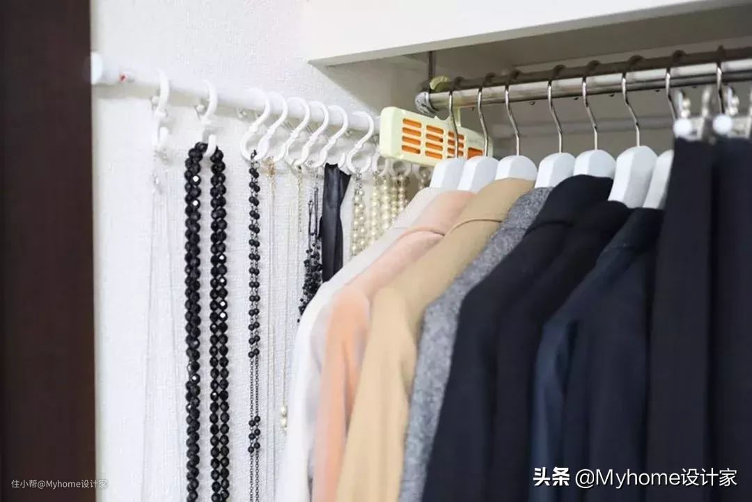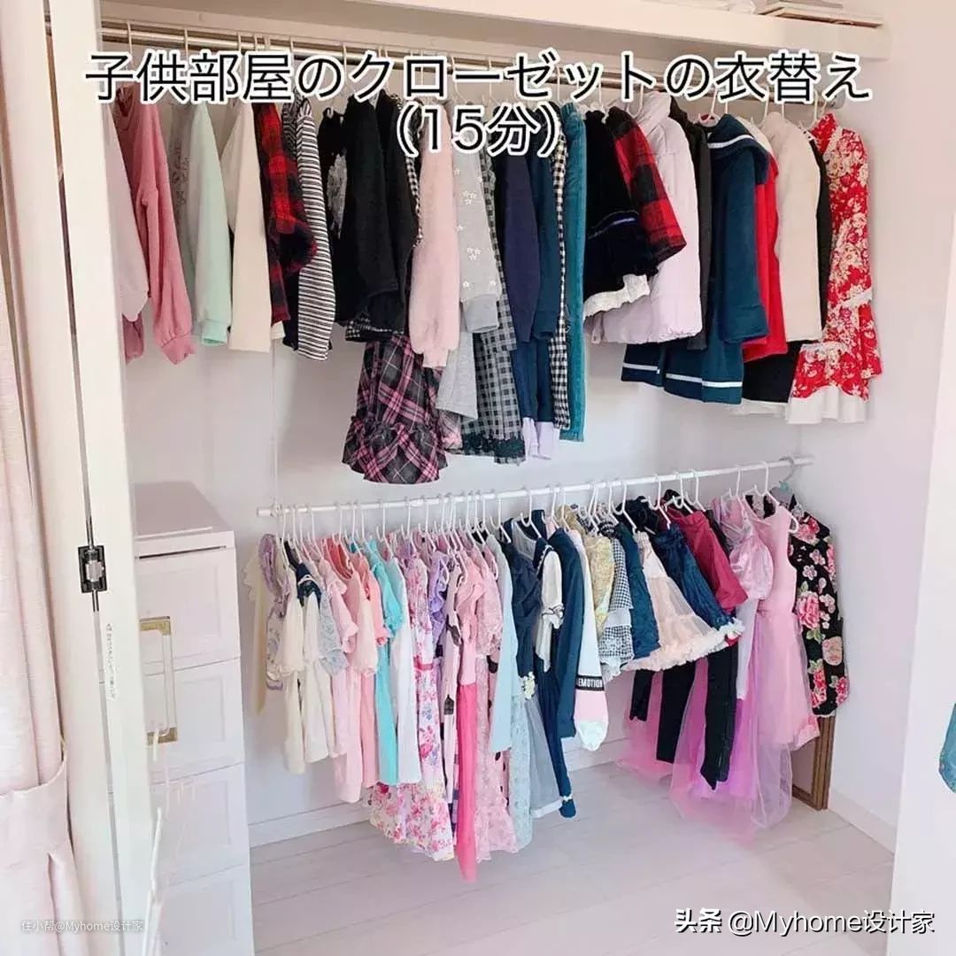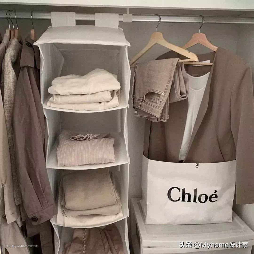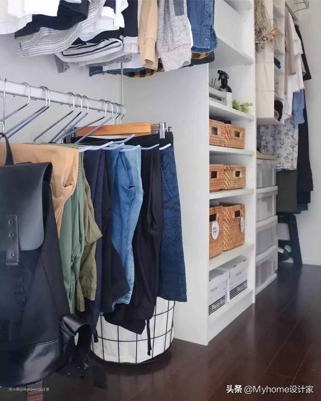 像日本主妇shoko将长裤对折吊挂,再依序安排短衣、长洋装、外套,形成阶梯状的吊挂设计,下方就留出有秩序的方正空间。