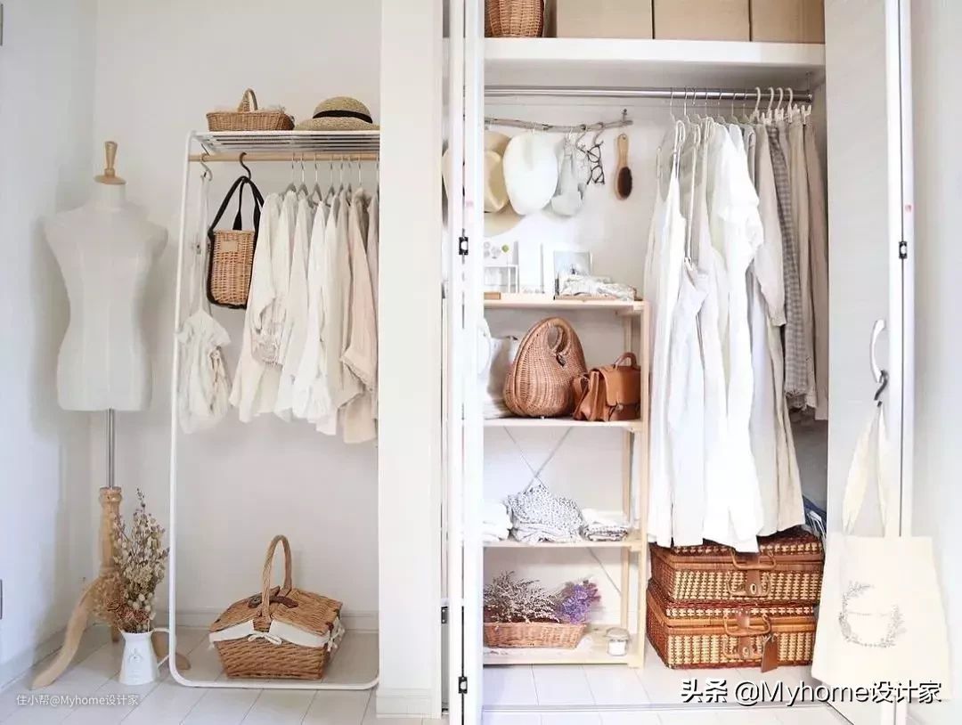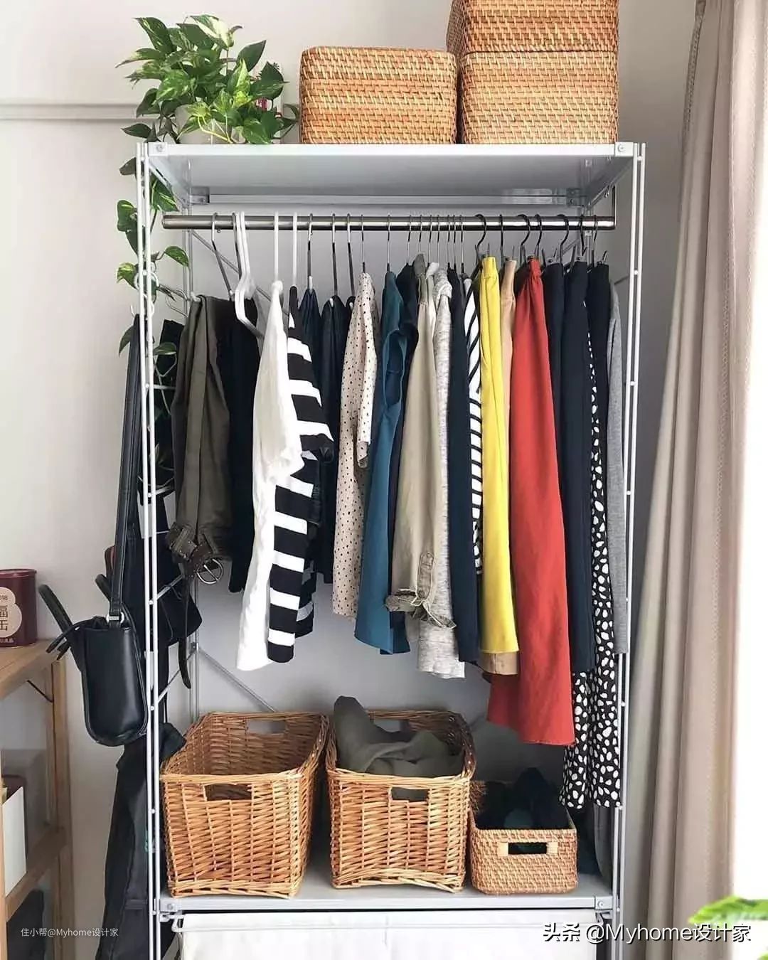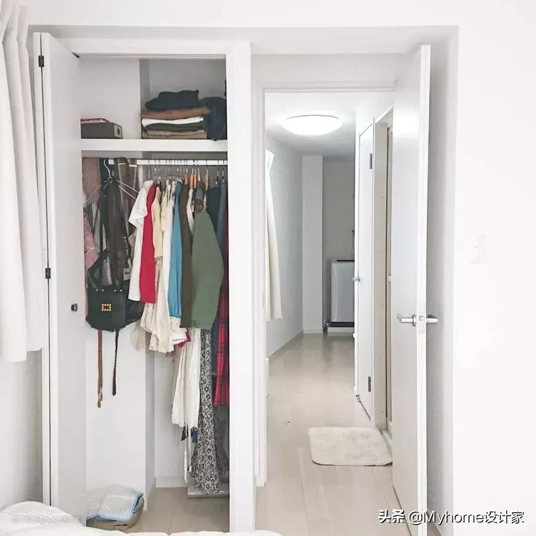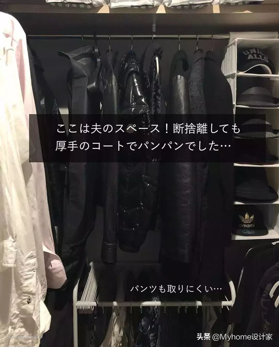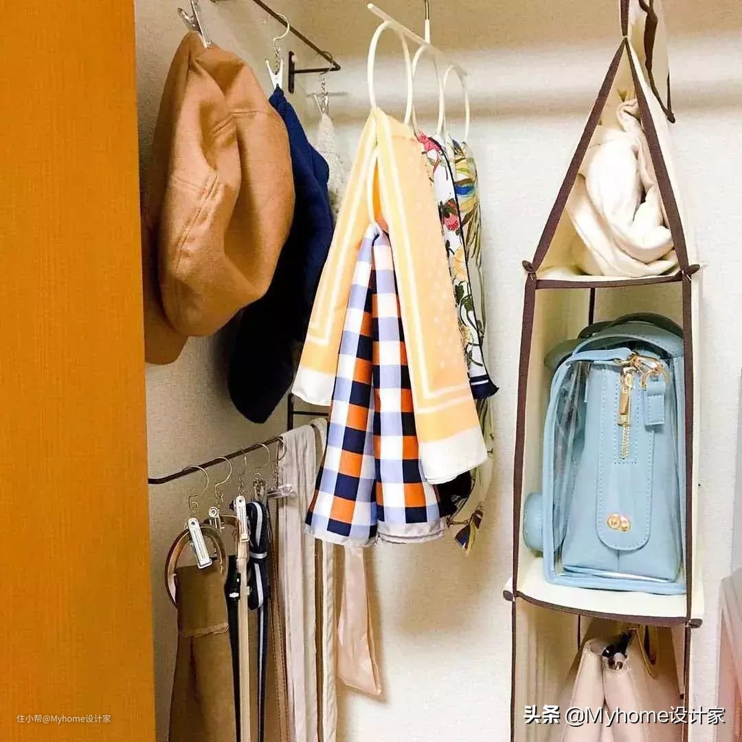 像日本主妇shoko将长裤对折吊挂,再依序安排短衣、长洋装、外套,形成阶梯状的吊挂设计,下方就留出有秩序的方正空间。