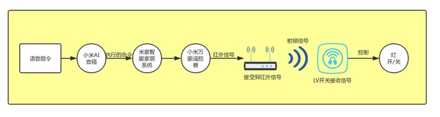 安装完LV开关可以说我们的工程就完成90%了,剩下的10% 就是红外转射频的配对调试了。需要使用到小米万能遥控器+红外转射频盒子(淘宝有卖外置型的,可以不用改装,方便新手使用)。原理如下: