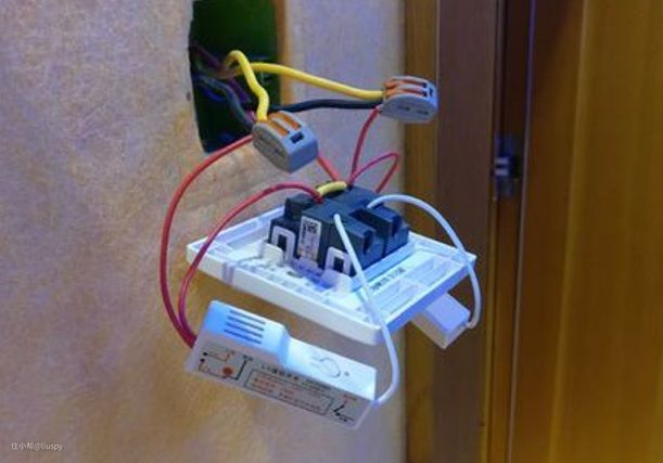 ▼实物链接示意图,接到开关面板后面是这个样子的