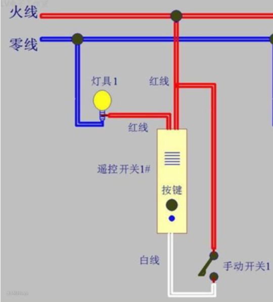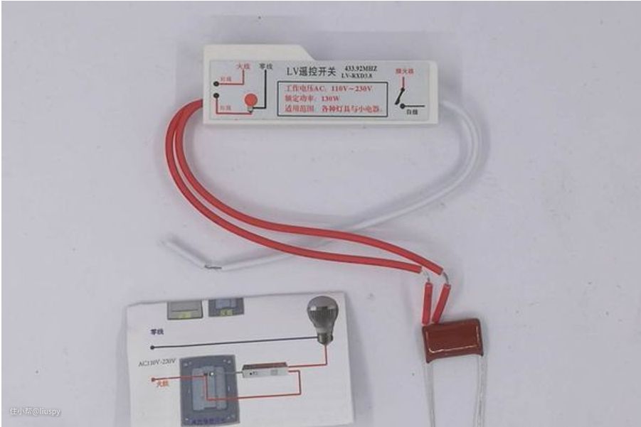 ▼LV开关的接线示意图,LV开关可以通过小米万能遥控器发出的射频信号控制开关,同时也可以通过原开关来控制开关,可以说是物美价廉