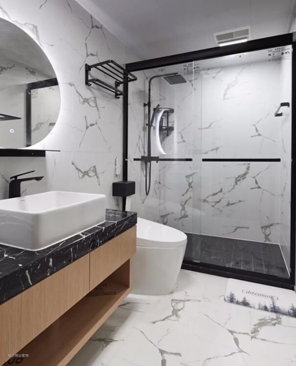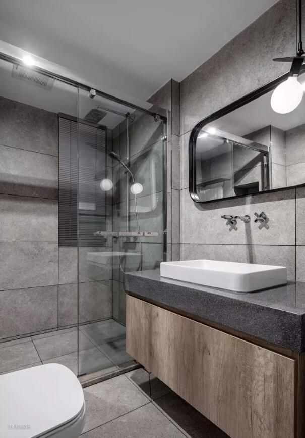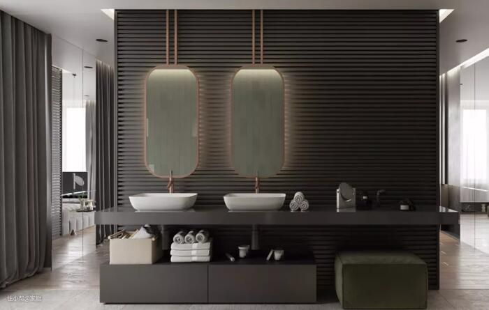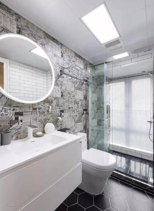 除此之外,还可以在灯光上下功夫,比如镜子旁的灯带,配合上光滑的大理石瓷砖,更显明亮。