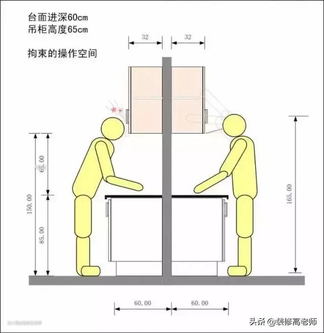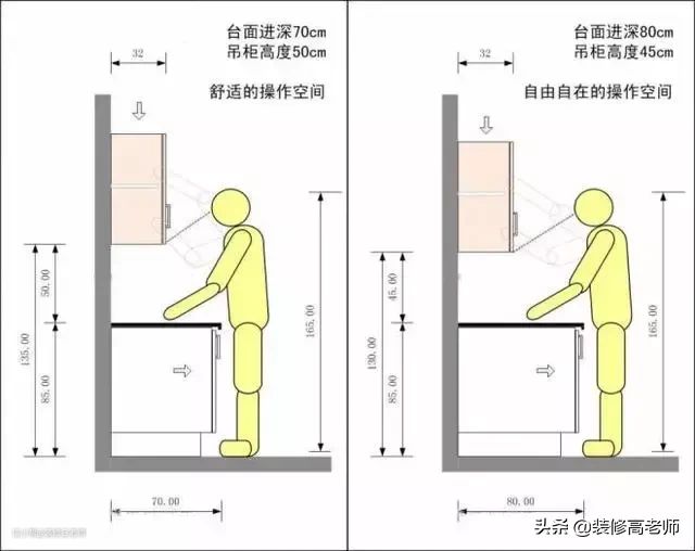 解决方法:增大橱柜操作台进深,降低吊柜布置高度,打造舒适或再有自在的操作空间!让你的老公从此爱上厨房!