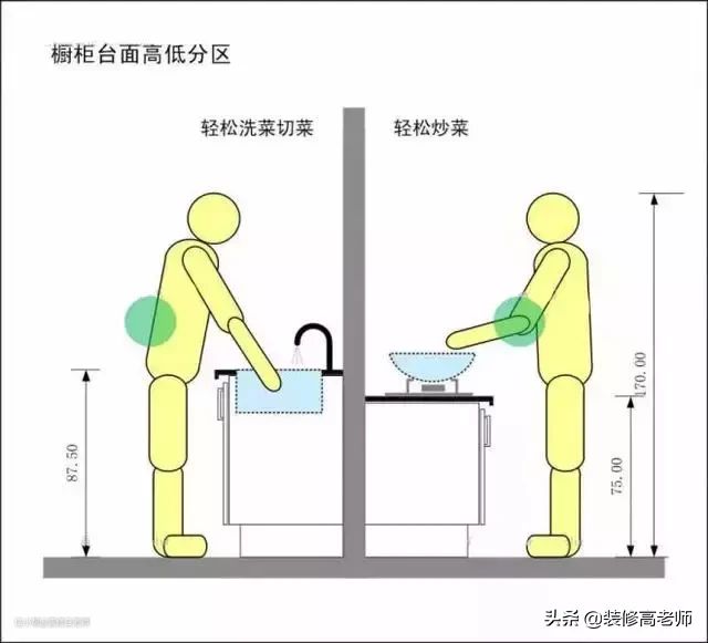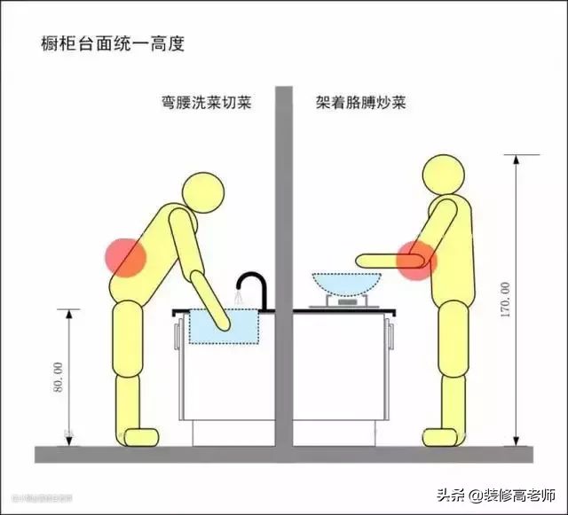 问一:橱柜台面都是相同高度,我要弯腰洗菜、切菜,架着胳膊炒菜……真心累!