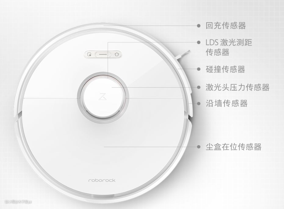 机器人顶部凸起的地方是压力传感器和LDS激光测距传感器,配合LDS导航算法可以快速的绘制出房间地图,并且对扫地路线进行合理规划。
