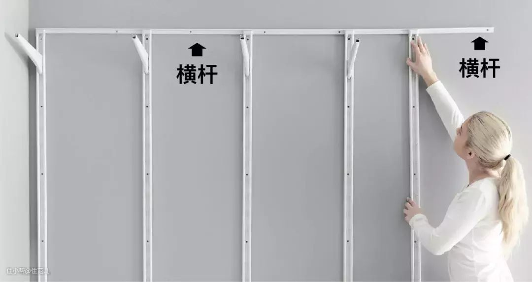 所以,必须按这三个宽度,用挂杆,横向把墙面分割成数份。