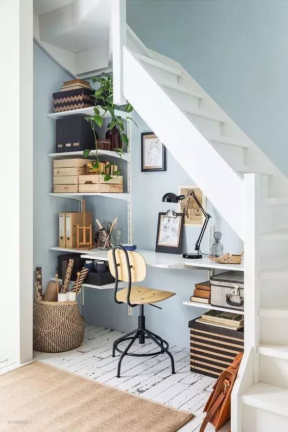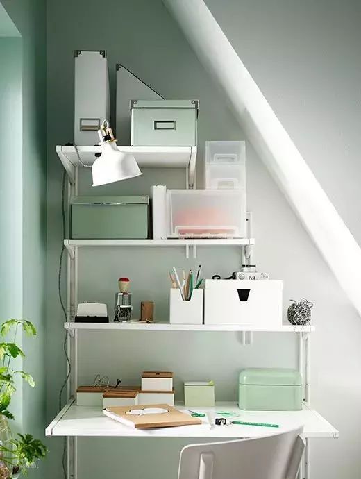 充分利用楼梯下、坡顶下不规则的三角形墙面进行储物,甚至硬生生搭出一个写字桌!