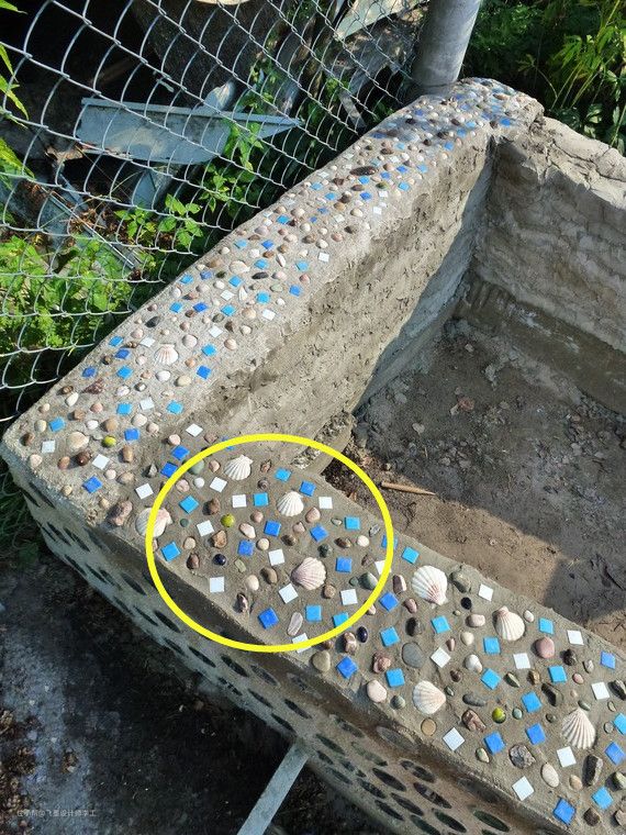 另外等到利用啤酒瓶和混凝土浇筑到预定的高度后,完全干燥再在表层浇筑一层混凝土,趁着混凝土还没干燥时,将准备好的石子、马赛克和贝壳,统统嵌入在混凝土表层上。