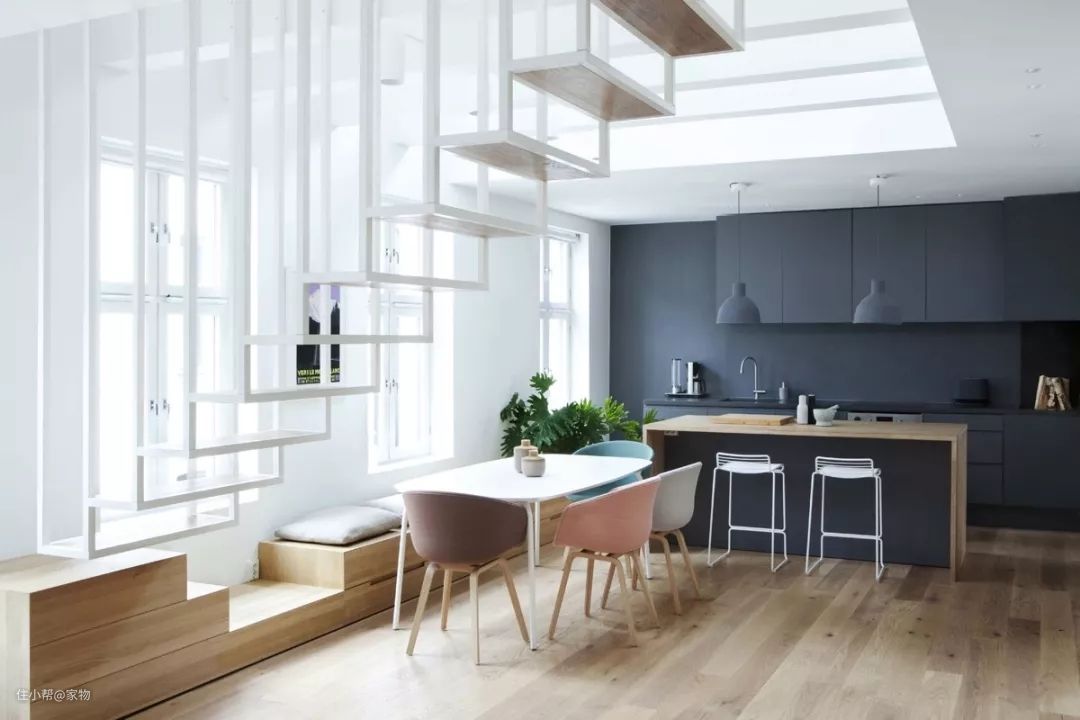 还可以在楼梯的侧面安装许多可以用来收纳的柜体,节省屋内空间