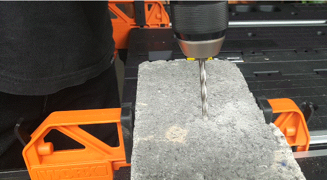 再试试钻混凝土之类的物体,找来一块平时打架用的砖头,再换上大一点的钻头,启动电源对着砖头一顿输出,同心度还是很稳,没有偏移的情况,强度也很足。以后可以用这个钻洞借邻居的光用,能省不少电费。